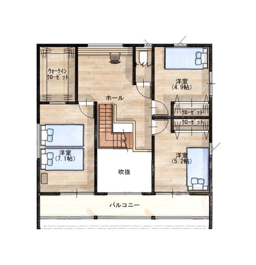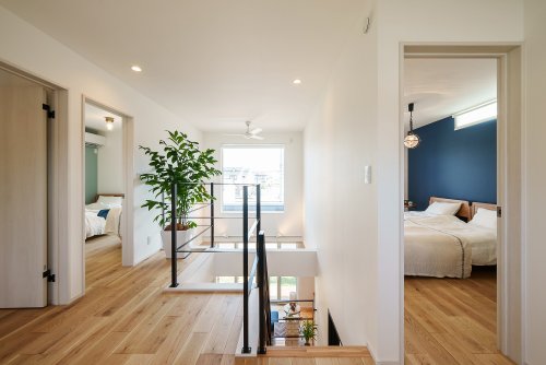 吹き抜けの大きな窓から光が差し、二階ホールも明るく爽やか