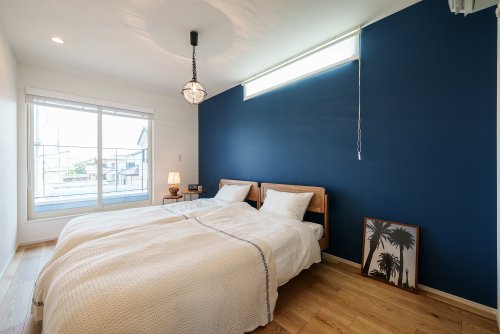 ブルーの壁紙が爽やかな寝室は海外のホテルにいる気分になります!