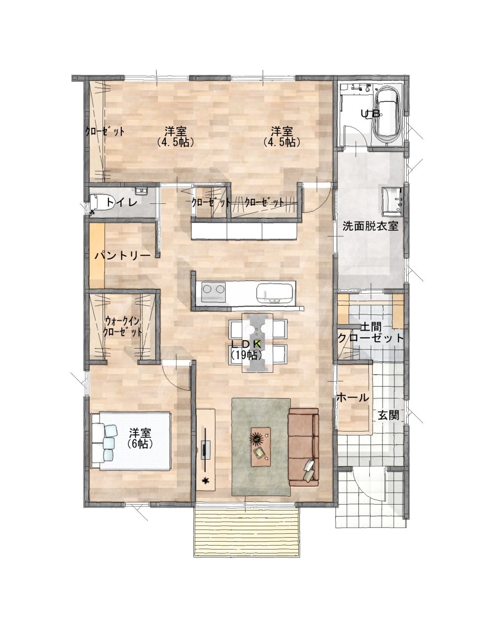 玄関から土間収納を通って洗面所へ直行できる便利なレイアウト
