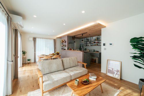 明るいLDKはグレージュをアクセントにして、落ち着いた雰囲気に