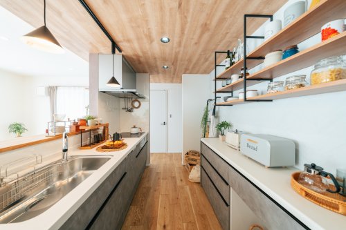 回遊できるキッチンは魅せるオープン棚と木目でお洒落な空間を演出♪