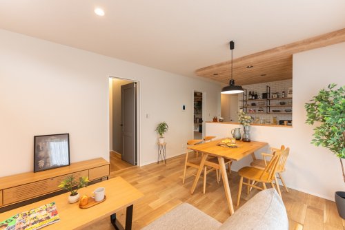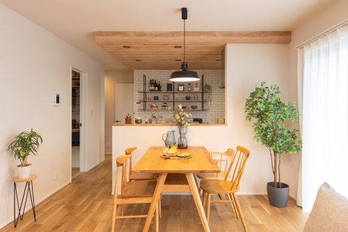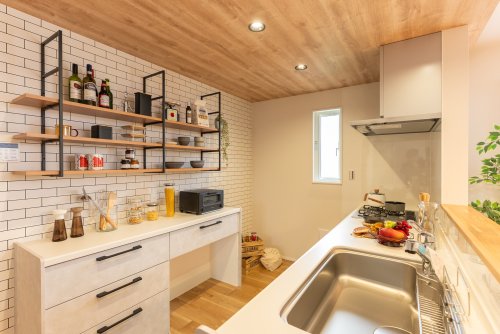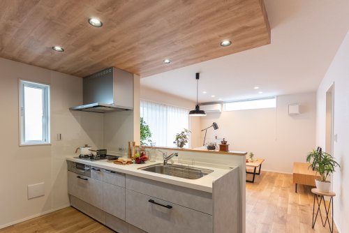 キッチン上の木目天井がアクセントとなり、シンプルな空間にあたたかみをプラス。